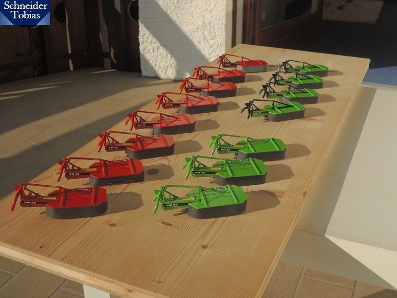 Ich setzte wieder verschiedene Varianten und Wünsche um. Dabei entstanden acht klassische KM 22 in Rot, drei mit grüner Lackierung sowie vier Exemplare in den neuen Deutz-Fahr-Farben. Ein Mähwerk ist rein auf die Zwitter-HH von Weise-Toys ausgelegt; bei allen anderen ist der Anbaubock nach dem Vorbild des Originals umgesetzt. Ferner ist auch ein Mähwerk entstanden, das ein graues Schutztuch hat. Dieses möchte ich für mich altern. Neben den Deutz-Fahr-Mähwerken sind noch weitere Mähwerke im Bau, die baugleich oder ähnlich zum KM 22 von Deutz-Fahr sind. Dazu aber ein andermal mehr.