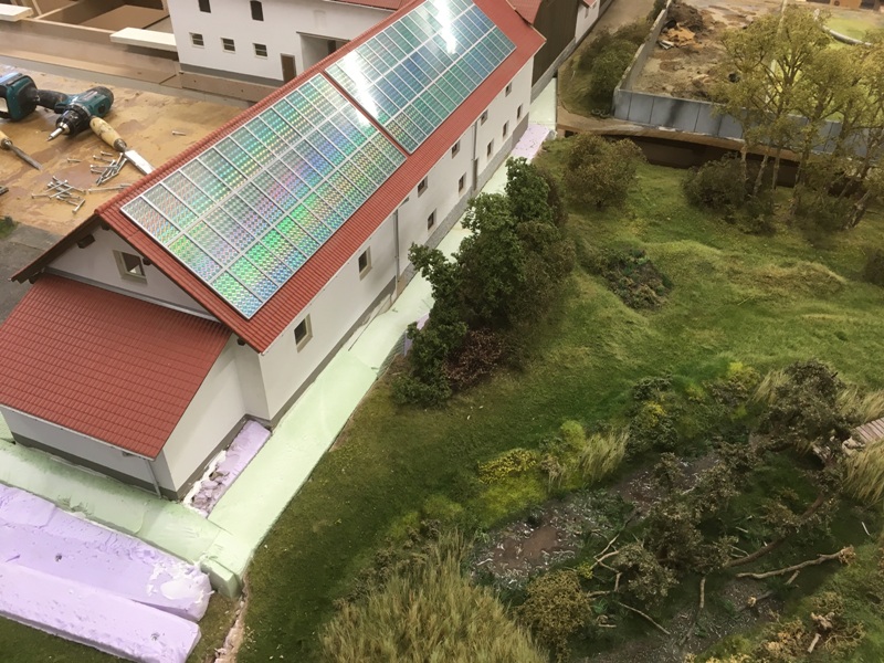 Die Gebäude haben jetzt ihren festen Platz bekommen, sind ausgerichtet und befestigt und werden jetzt angearbeitet und in die Landschaft integriert.