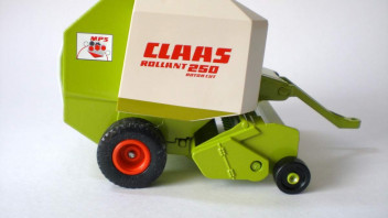 Beim Siku-Modell handelt es sich um die 1. Version der Claas-Rundballenpresse Rollant 250 mit der "Rotor Cut" statt der richtigen "Roto-Cut"-Beschriftung: