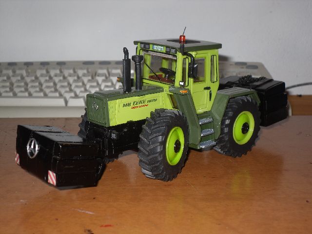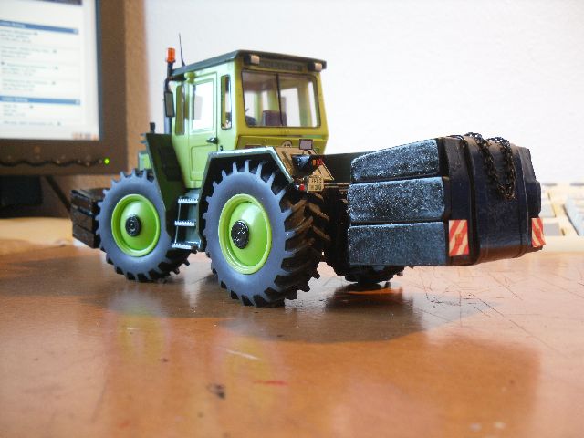 Hier mal mein leicht gesuperter Trac von Siku, Gewicht sind eigenbau aus einer Stahlplatte, Der schlepper bringt mi Gewicht 1,5 kg auf die Waage!
