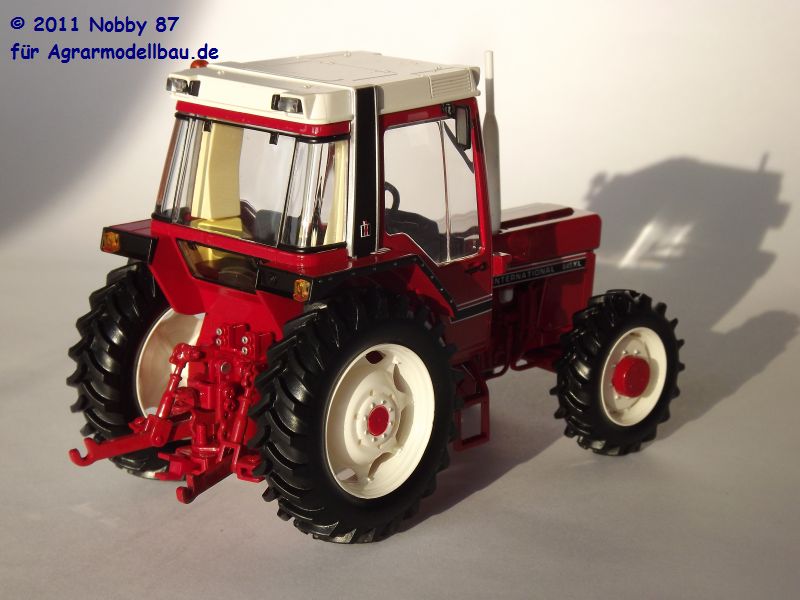 Im Anschluß ein Rundgang um den Schlepper. Mir gefällt das Teil unheimlich gut. Wenn er nicht diese d***** Stummelkotflügel hätte würde ich ihn zum besten IHC Großserienmodell aller Zeiten küren. Die Türen lassen sich zwar nicht öffnen, wie beim Schuco IHC 1455 XL, auch läßt sich der Auspuff zum vorbildgerechten öffnen der Motorhaube nicht abnehmen. Dafür hat der Schlepper ein vorbildgerechtes Hubwerk im Heck. Für einen reinen Vitrinenschlepper der nicht auf dem Kaffeeacker arbeiten muß, bevorzuge ich diese Art.
