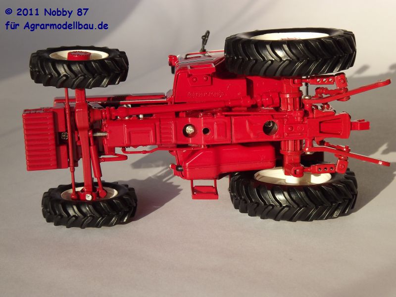 Im Anschluß ein Rundgang um den Schlepper. Mir gefällt das Teil unheimlich gut. Wenn er nicht diese d***** Stummelkotflügel hätte würde ich ihn zum besten IHC Großserienmodell aller Zeiten küren. Die Türen lassen sich zwar nicht öffnen, wie beim Schuco IHC 1455 XL, auch läßt sich der Auspuff zum vorbildgerechten öffnen der Motorhaube nicht abnehmen. Dafür hat der Schlepper ein vorbildgerechtes Hubwerk im Heck. Für einen reinen Vitrinenschlepper der nicht auf dem Kaffeeacker arbeiten muß, bevorzuge ich diese Art.