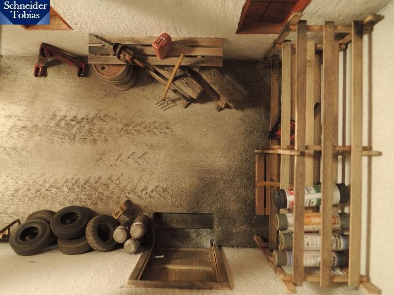 Die Alterung von dem Betonboden ist wirklich toll geworden mit den Reifenspuren Die anderen Details gefallen ebenso. Weiter so, da ist noch viel Platz für Krempel;)