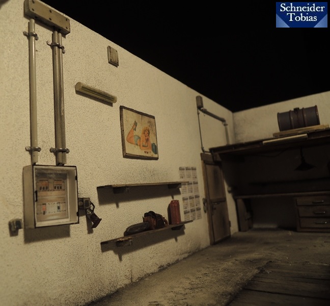Eine detaillierte Ansicht auf die Leitungen: Die, die nach rechts verläuft, führt zu einer alten Lampe über der Werkbank. Die Leitung nach unten versorgt eine Leuchtstofflampe. Es ist allerdings nichts funktionsfähig - alles nur Attrappen.;)