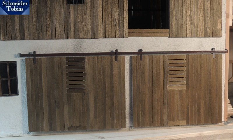 Die große Garage erhielt zwei Tore, die man übereinanderschieben kann. Mittig muss ich allerdings noch eine Befestigung an die Schienen anbringen, da diese sonst mit der Zeit durchhängen würden. Später folgen auch noch die Griffe.