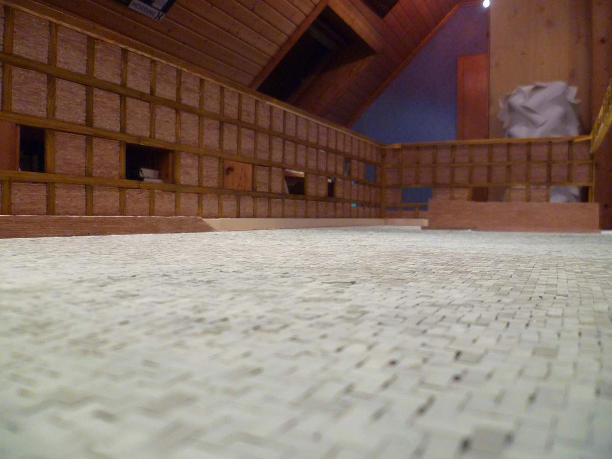 Der Boden ist schon zum Teil gepflastet und die Wände bestehen aus Fachwerk die schon so gut wie ausgemauert sind