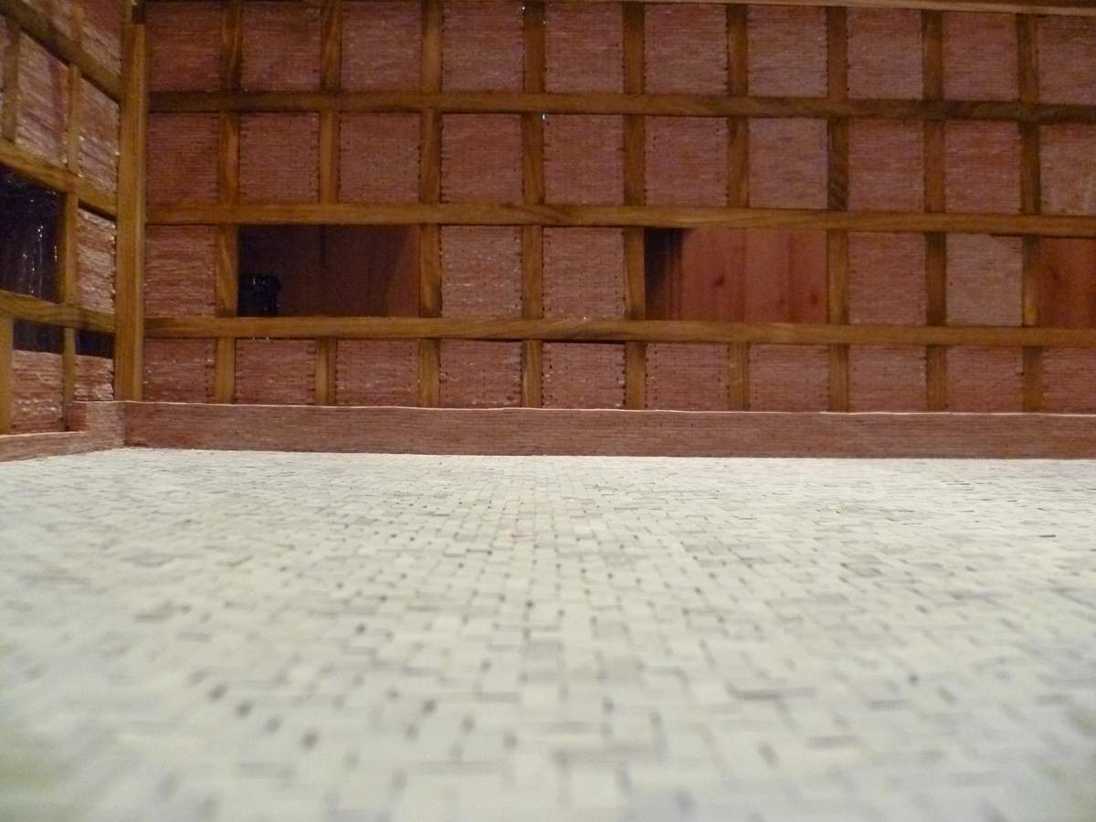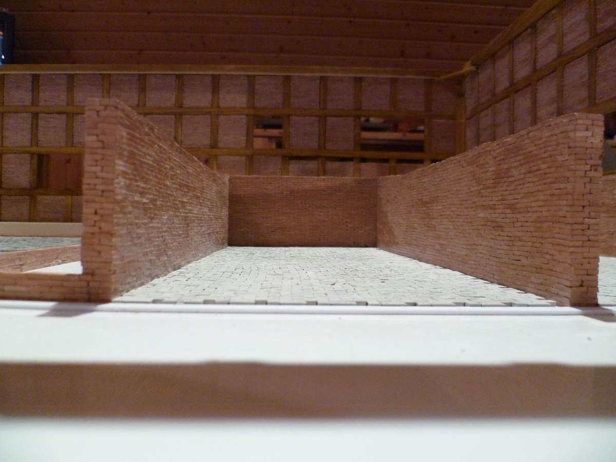 Der Boden ist schon zum Teil gepflastet und die Wände bestehen aus Fachwerk die schon so gut wie ausgemauert sind