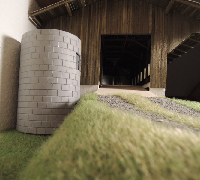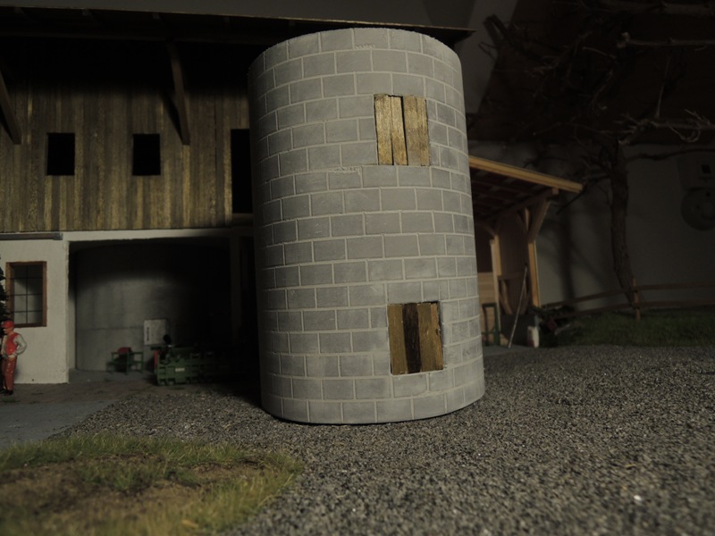 Die beiden Hochsilos wurden aus kleinen Betonsteinen gebaut. Hierzu habe ich in eine Hartschaumplatte(???) Fugen geritzt und die Platte dann auf ein Kunststoffrohr geklebt.