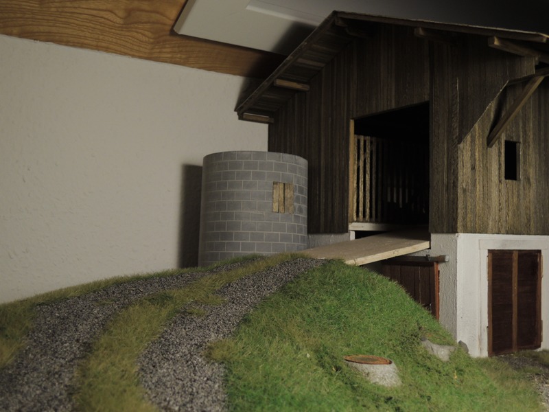 Beim linken Hochsilo ist die untere Luke um 45° versetzt (ziegt nach links; vgl. 1. Bild), da die Auffahrt direkt an das Silo anschließen wird.