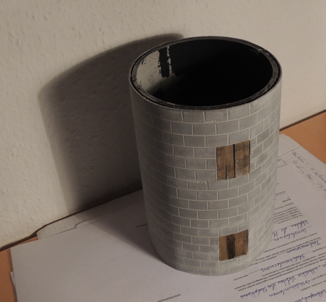 Die beiden Hochsilos wurden aus kleinen Betonsteinen gebaut. Hierzu habe ich in eine Hartschaumplatte(???) Fugen geritzt und die Platte dann auf ein Kunststoffrohr geklebt.