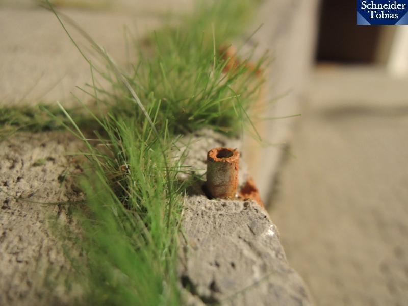 Durch den Regen (genauer: durch das herablaufende Wasser an der Mauer) bildeten sich Rostflecken neben den Rohren. Ein bisschen werde ich den Rost aber noch abschwächen.
