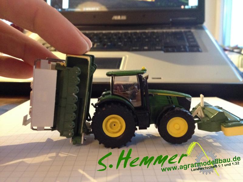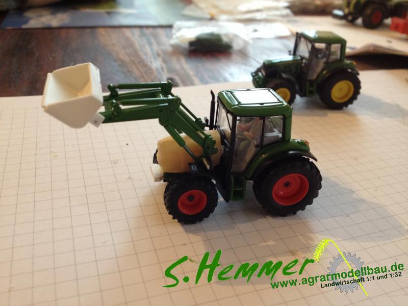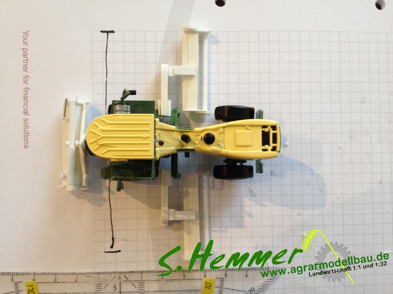 Das zerlegte und bereits ein wenig angepasste Grundmodell ist ein Wiking JD 6920s, Räder sind von einem Schuco Claas.