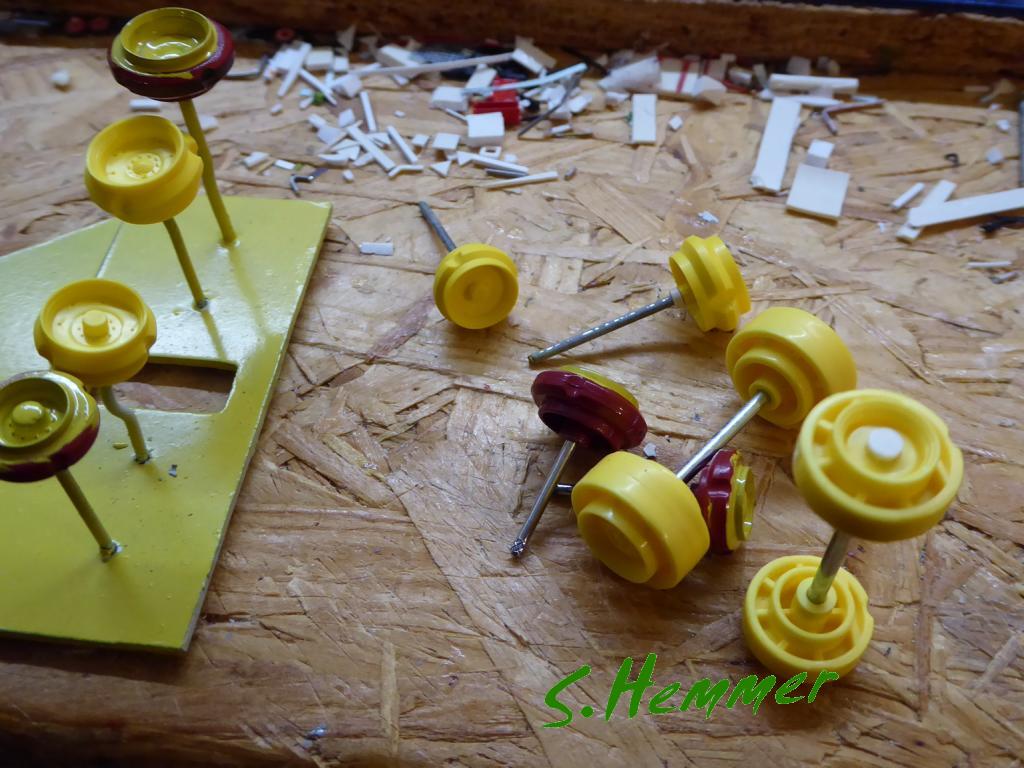 Zwei Radgewichte gab es auch noch. Leider noch die alte Form... die neue müsste man mal fräsen lassen, den Meterstab hatte ich mal an eines hingehalten. Ich habe es auch kurz mit selber schnitzen probiert aber dann schnell aufgegeben.