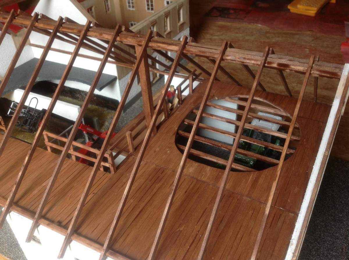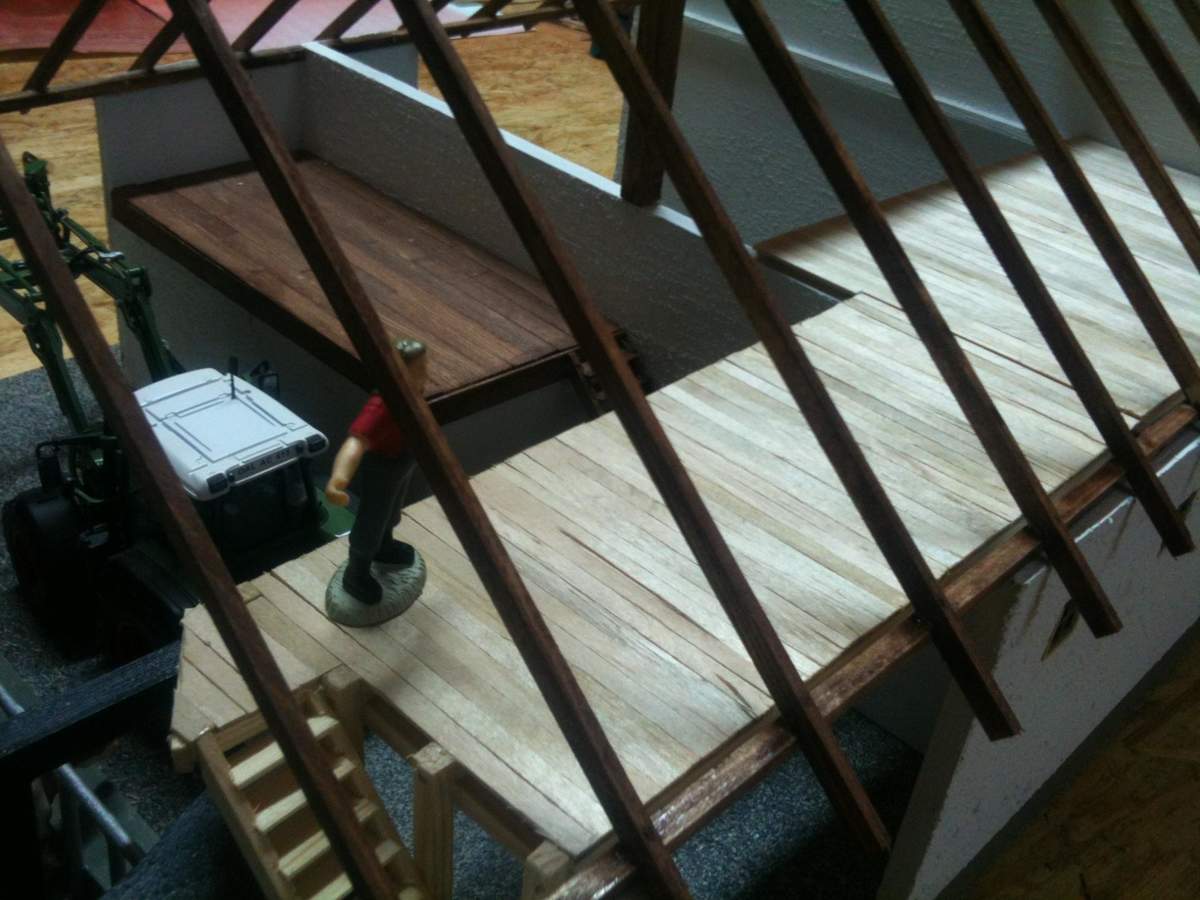 Der Dachstuhl wurde komplettiert. Dieser ist auf der wohnhausabgewandten Seite komplett herausnehmbar um später Szenen im Gebäude besser ändern zu können. Weiterhin wurde die "Brücke" zwischen Stall- und Scheunenteil angefertig und ein teil des Strohbodens über dem Geräteschuppen. Die Bauteile müssen noch gealtert werden. auch diese werden herausnehmbar bleiben um in die unteren Bereiche des Gebäudes zu kommen. Weiterin habe ich mal fix ein Dach angefertigt.