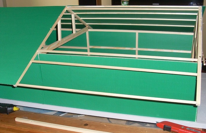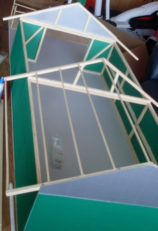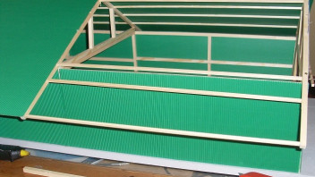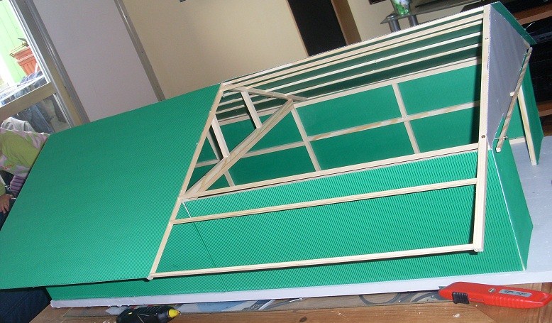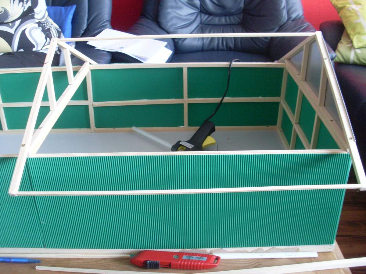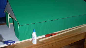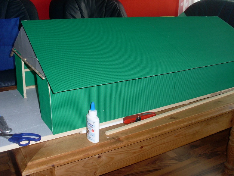 Das mit der Farbe ist sicherlich ein Stück weit auch Geschmacksache, am Dach hätte ich sicherlich auch mit Schwarz arbeiten können. Komplett grün finde ich aber auch nicht schlecht, die Giebelseiten habe ich oben mit Silber- bzw. Alufarbener Wellpappe verkleidet. Da die Halle ein Modell aus der Moderne darstellt, denk ich persönlich, dass das schon gut hinkommt.