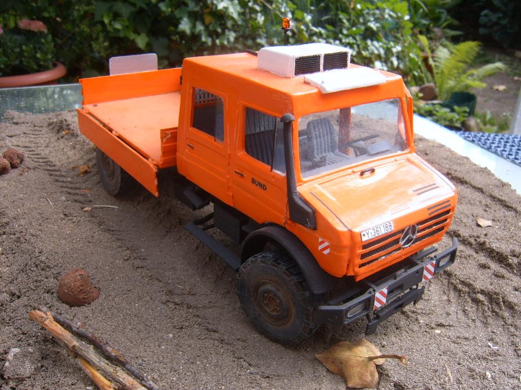 Hallo hier stelle ich mal auf Wunsch meinen selbst gebauten Mog vor ,dieser enstand aus zwei Plastikbausätzen und viel Kunstoffplatten und Spachtel der Unimog soll das neue Grill haben.