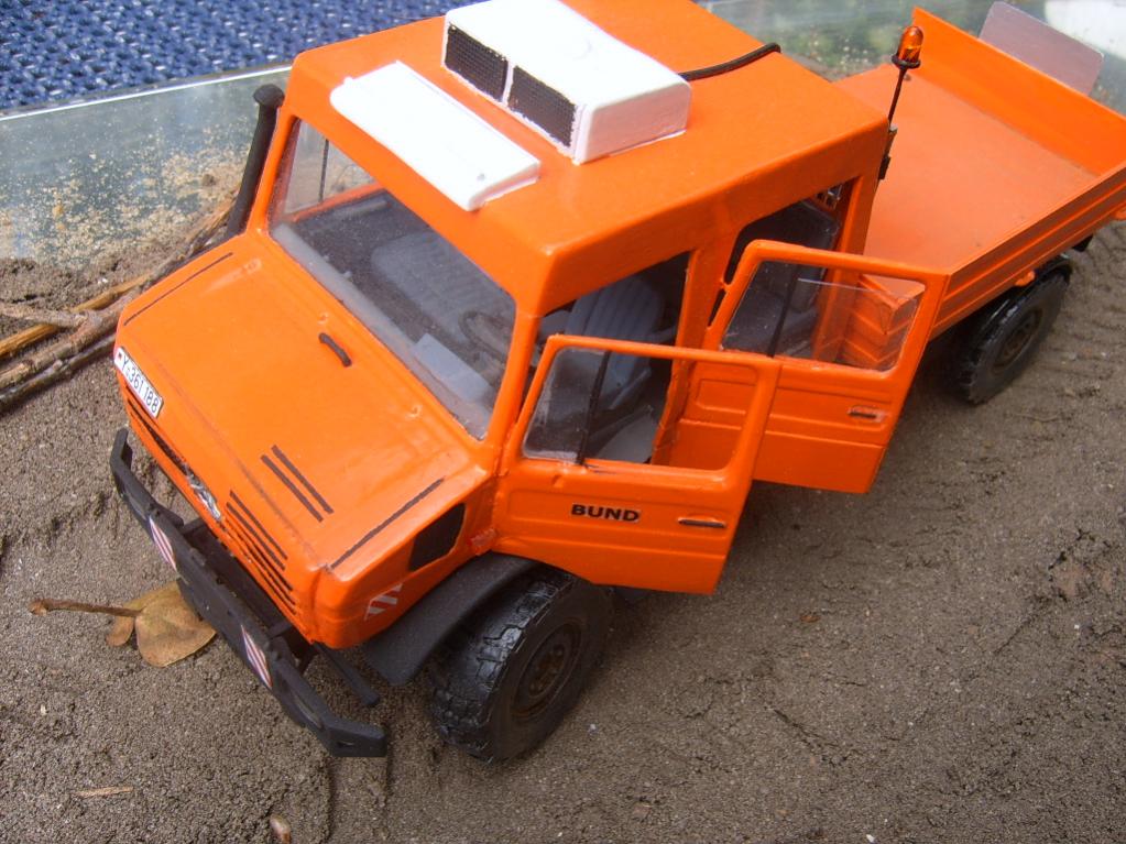 Hallo hier stelle ich mal auf Wunsch meinen selbst gebauten Mog vor ,dieser enstand aus zwei Plastikbausätzen und viel Kunstoffplatten und Spachtel der Unimog soll das neue Grill haben.