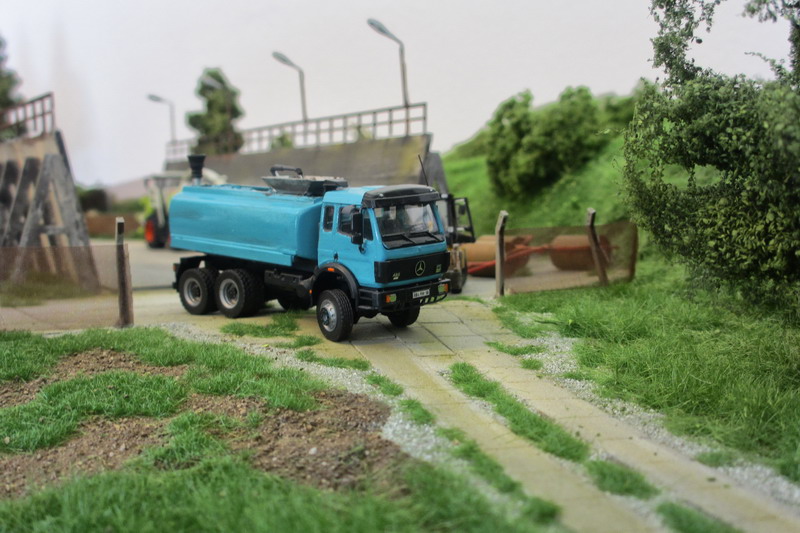 Norbert: Der SK ist auf Memo-Basis entstanden, mit angepassten Heizöltank von Kibri. Er ist so (ähnlich) tatsächlich im Einsatz gewesen und bringt Gülle zu einem Terra-Gator - allerdings mit dem kurzen Fahrerhaus.Gruß