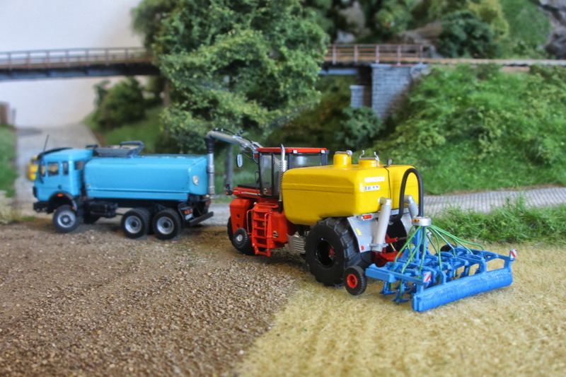 Norbert: Der SK ist auf Memo-Basis entstanden, mit angepassten Heizöltank von Kibri. Er ist so (ähnlich) tatsächlich im Einsatz gewesen und bringt Gülle zu einem Terra-Gator - allerdings mit dem kurzen Fahrerhaus.Gruß