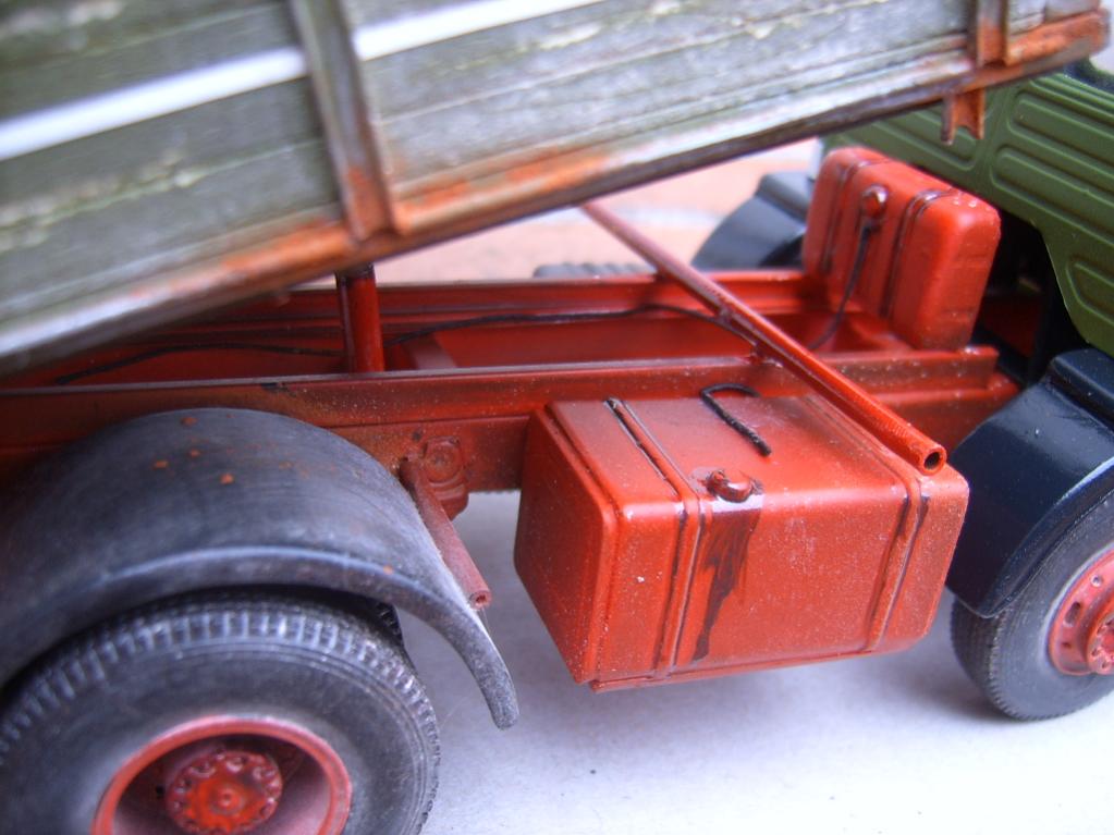 Hi leute es geht weiter habe mal versucht Ihn zu Altern ich hoffe ist nicht zu dolle, das Fahrerhaus muß noch.Er hat Planenschnur bekommen Fenster und Streben Hydraulikleitungen und wieder n bissl Farbe und Rost.