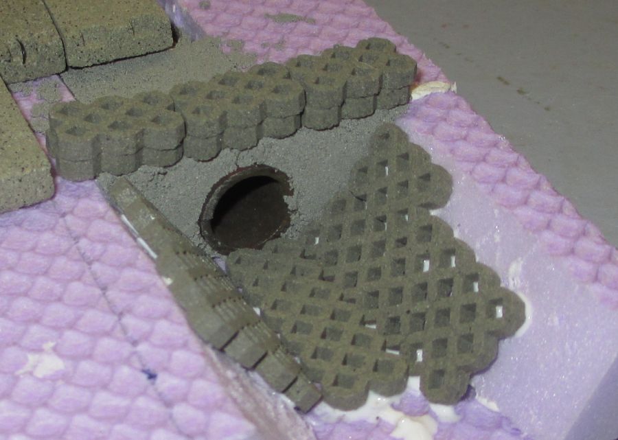 Auf dem Bild ist das Rohr schon eingeklebt. Auch die Styrodurplatten sind verklebt und die fehlenden Ecken und Streifen ergänzt.
