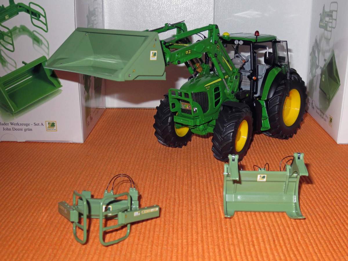 Valtra in rotmetallic, Frontlader Werkzeuge Set A in Bressel und Lade grün + John Deere grün. Dazu noch die Serienversion des Claas Axion 950 Zwillingsbereift.