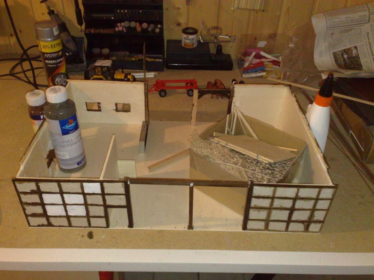 So bin seit ein paar Tagen endlich dazu gekommen, die alte Scheune des Holthofes zu bauen. Sie besteht auch aus Fachwerk. Die Scheune hat eine Durchfahrt mit Deele, im hinteren Bereich eine Werkstatt, im linken Teil der Deele ist ein Stall untergebracht, für Kälber und Rinder. Des Weiteren finden im rechten Teil der Deele vor der Werkstatt noch einige Maschinen Platz. Alles in allem ist die Scheune innen recht verbaut, die Scheune wird 60x40cm als Grundfläche haben.