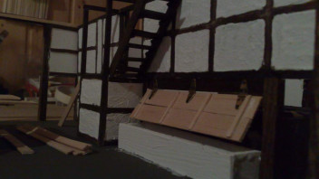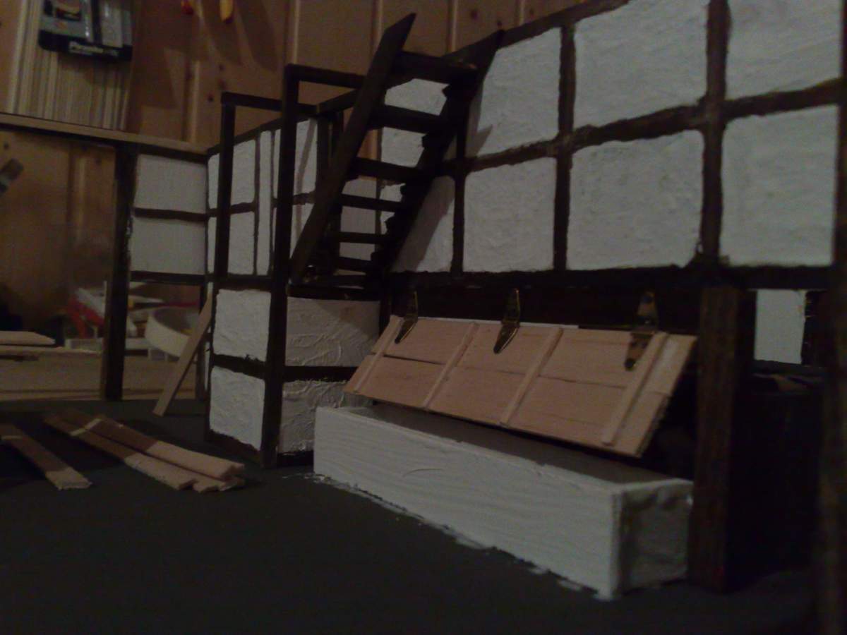 So heuer gings auch etwas weiter, die Treppe zum Heuboden ist dran. Dann habe ich die Futterklappe samt Trog fertig, ist zwar etwas altertümlich aber bei uns in der Ecke findet man sowas noch recht häufig in alten Ställen. Vorbild war da die Deele meiner Großeltern, die Klappe wird geöffnet sobald der Trog gefüllt ist, so gelangt das Vieh an sein Fressen.