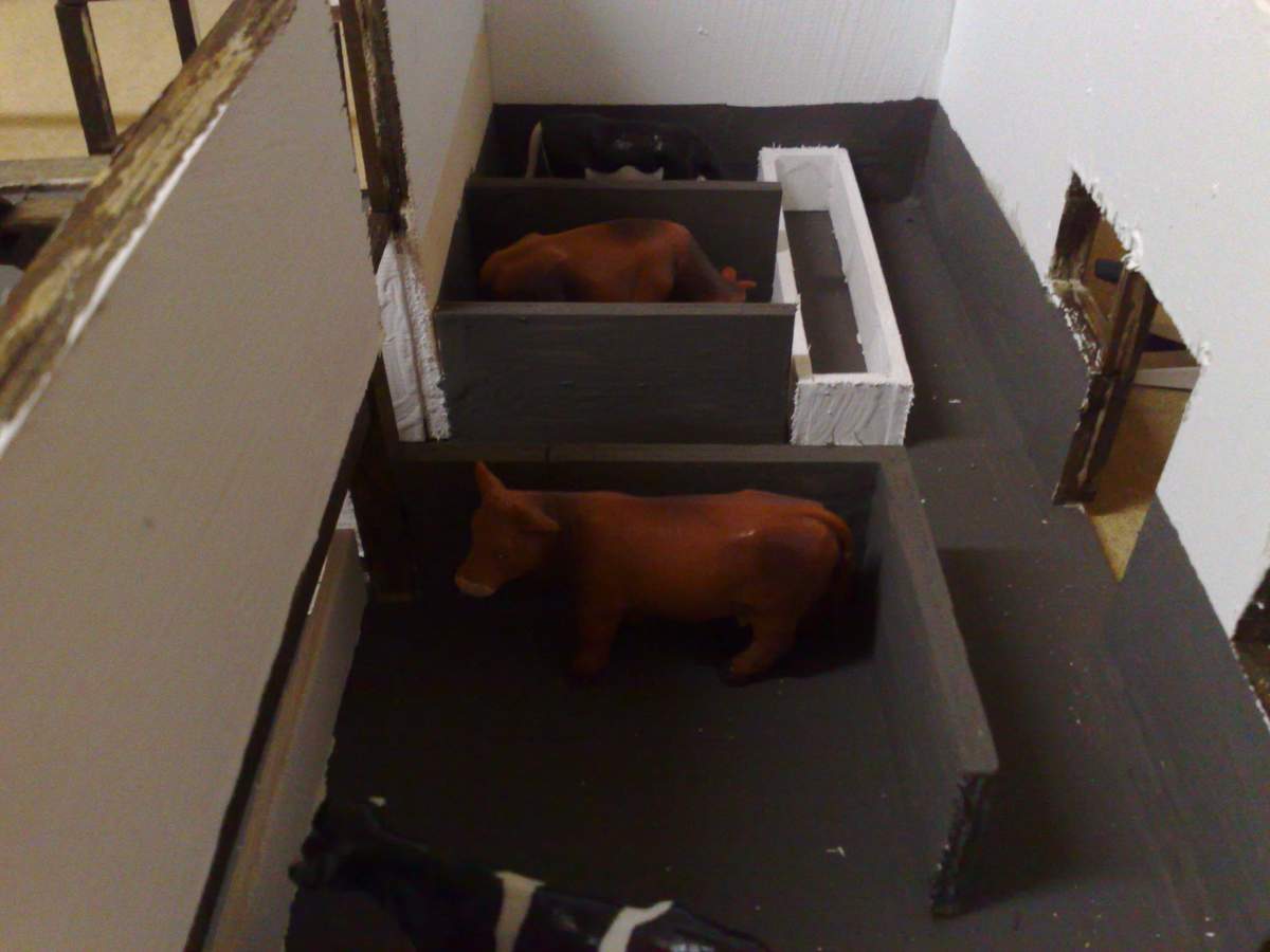Blick in den Stallteil, in den hinteren Boxen werden Kälber unterkommen, im Original waren dort Ferkel. Die vordere Box bietet Platz für 4-5 Rinder.