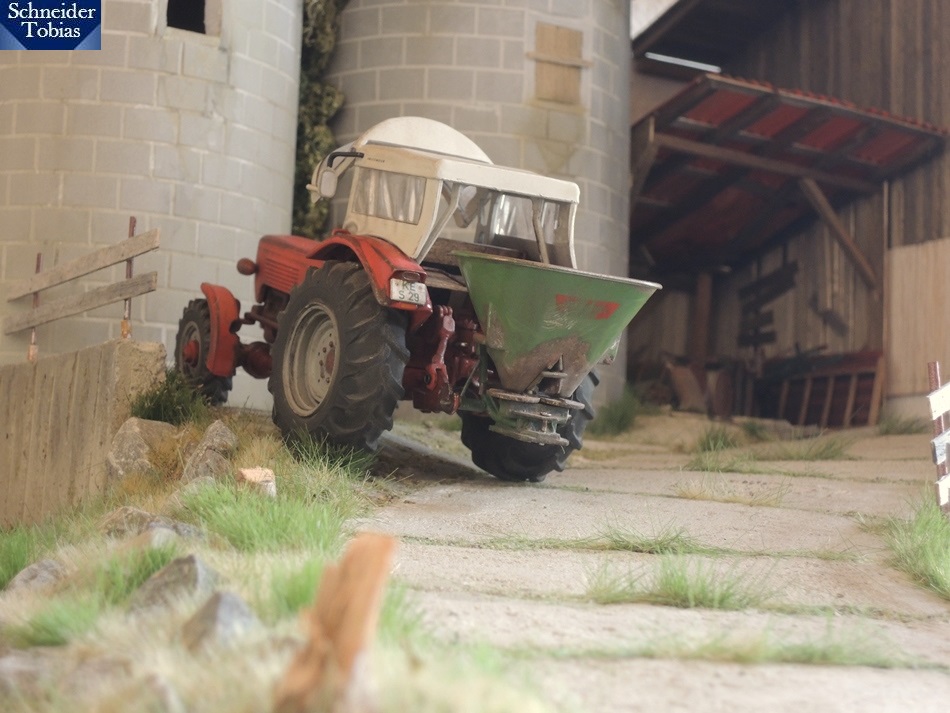 • Der Streuer sieht super aus, auch am Güldner. Ich würde dennoch mal überlegen, ob du nicht noch einen kleineren Schlepper dafür machst (z.B. Deutz 4006), das würde besser passen. So einen großen Güldner hat doch damals fast keiner als Pflegeschlepper gehabt. Jedenfalls hier nicht.