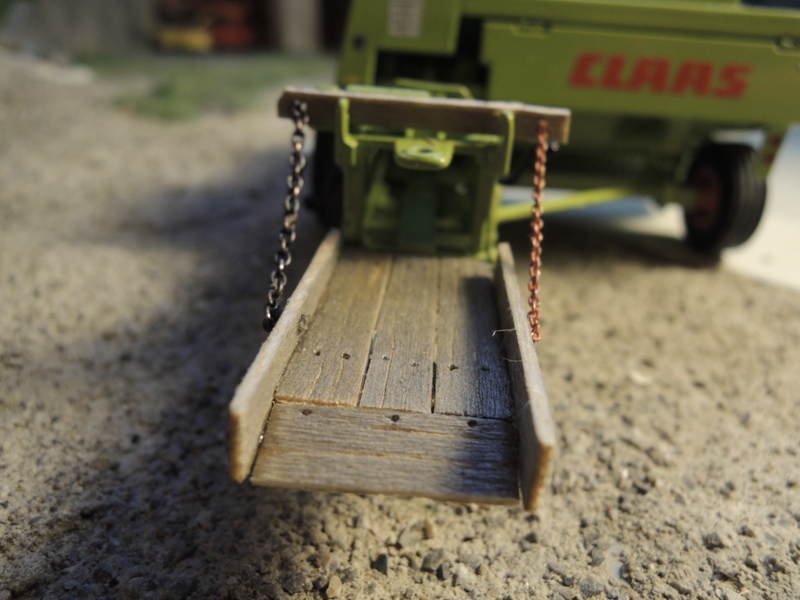 heute habe ich einen Miniumbau an meiner Markant 65 umgesetzt, der jedoch für den Gesamteindruck optische Auswirkungen hat. Zwar finde ich die Ballenschleuder schön gestaltet, aber ich kenne derartige Pressen eher mit einem einfachen "Ballenkanal". Daher habe ich die Schleuder entfernt und eine Verlängerung angebaut, um die Ballen am Boden ablegen zu können. Die Vorrichtung soll in 1:32 einen Eigenbau aus Holz darstellen.
