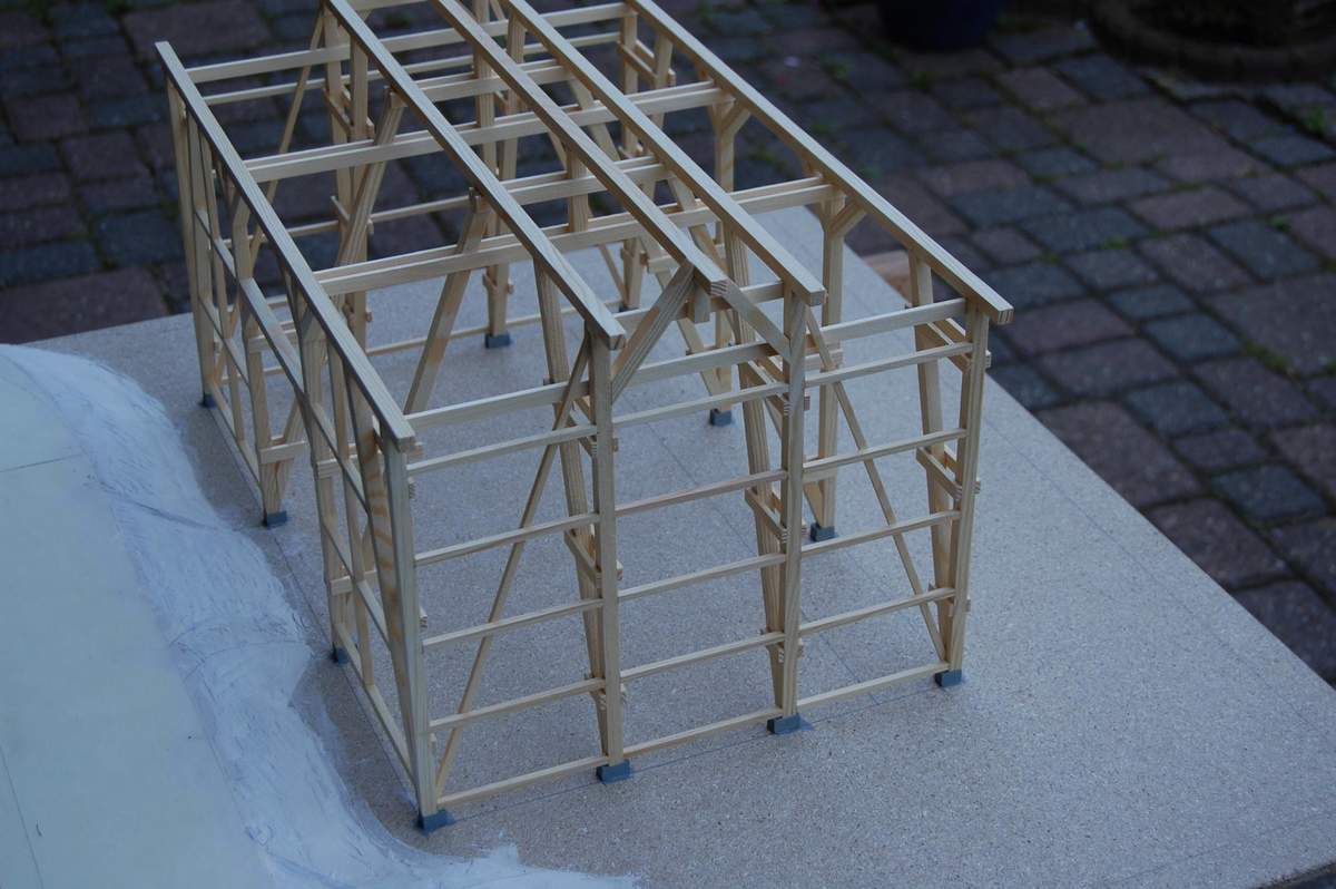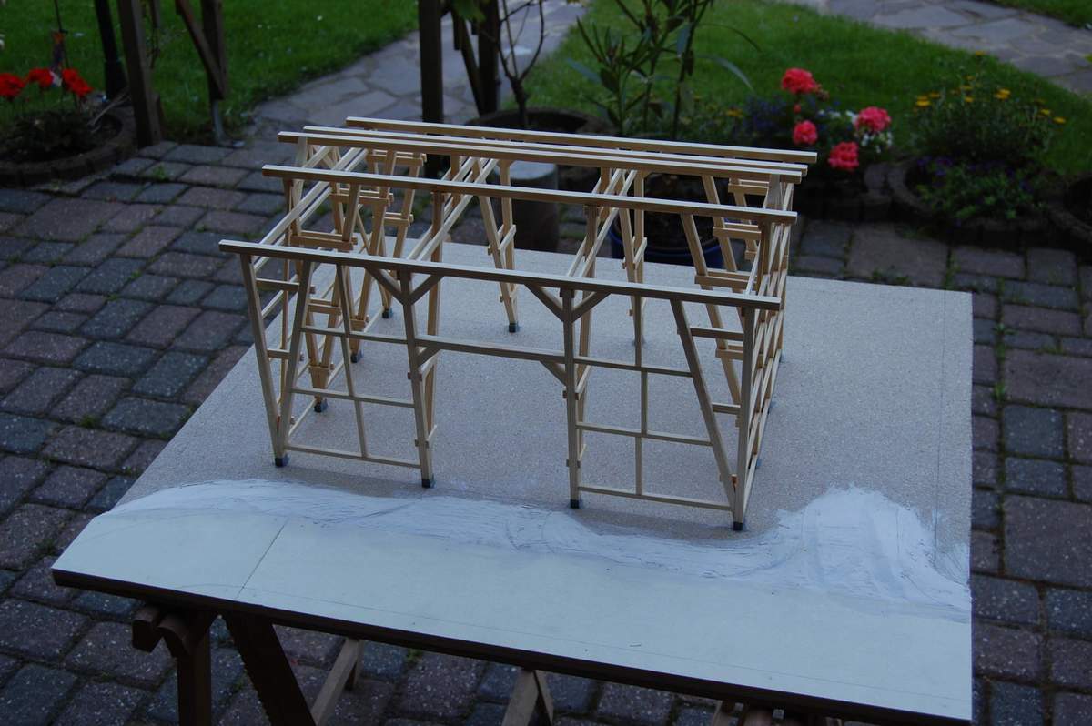 möchte euch mit und mit Bilder einer Feldscheune in 1:32 zeigen die ich im letzten Jahr gebaut habe. Leider habe ich keinen Platz für ein Diorama, aber die Scheune war mir ein Bedürfniss zu bauen. Das original steht leider nicht mehr, da vor 2 Jahren paar Kids meinten es wäre eine gute Idee in einer bis oben hin mit Stroh voll gestapelten Scheune zu rauchen und das ist in unserer Gegend leider nicht zum ersten mal passiert. Nur gut das keiner zu Schaden gekommen ist! Zurück zum Gebäude, wie die Überschrift schon sagt habe ich mich entschlossen die Scheune nach dem alten Vorbild aber mit modernen Materialien neu aufzubauen. Den Anfang macht das Grundgerüst.