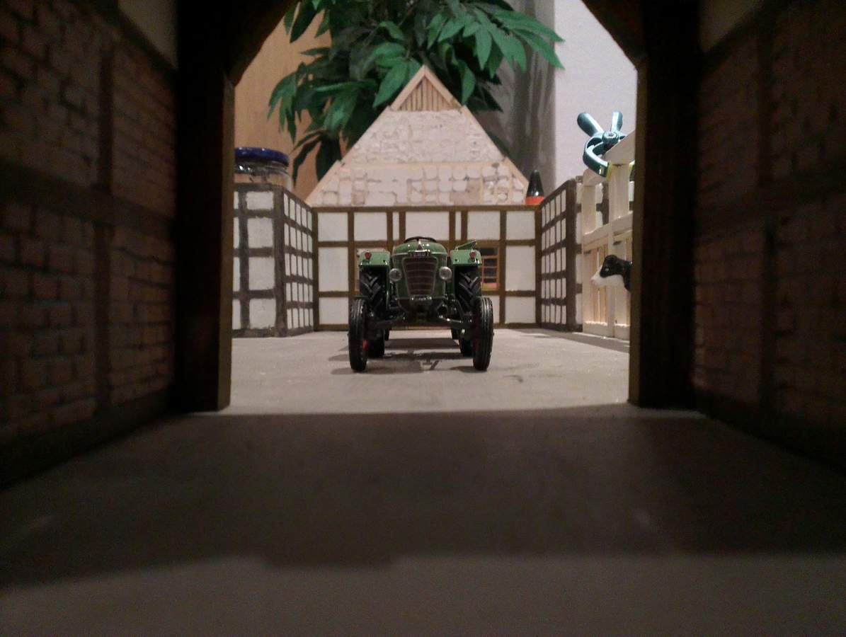 Der Blick durch das Tor auf die Diele mit dem Fendt Farmer 2: