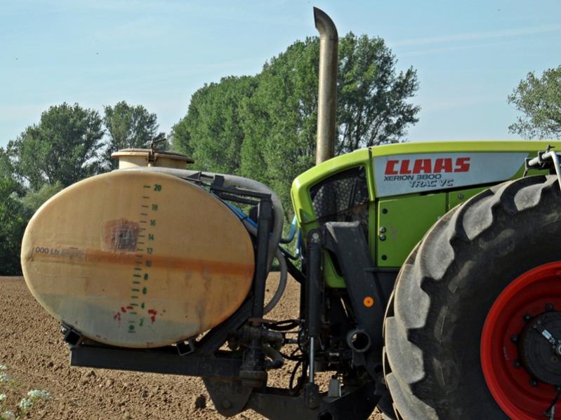 Der Injektierer selber hängt in der Fronthydraulik, da der Xerion mit gedrehter Kabine unterwegs ist. Dadurch hat man mehr Platz um den großen Düngertank unter zu bekommen.