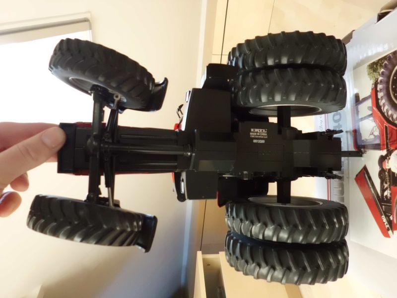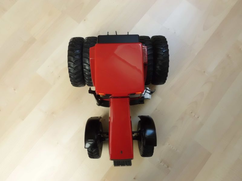 Der Traktor ist sehr schwer, laut Lieferschein über 3,5 Kilo. Der Großteil des Gewichtes versteckt sich aber im Rahmen / Unterbau, denn die gesamte Kabine, die Haube und die Heckhydraulik bestehen aus Plaste.