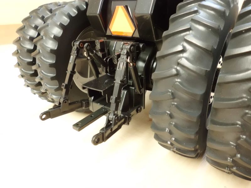 Ein solches Zugpendel findet sich im Heck natürlich auch. Dazu sechs Hydraulikanschlüsse, wobei von jedem der drei Blöcke einen angedeutete Leitung wegführt. Auf den ersten beiden Bildern erkennt man auch, dass die Felgen der inneren Räder durchaus realistisch nachgebildet sind. Man kann ihn also auch nach Abtrennen der Zwillinge in die Vitrine stellen.