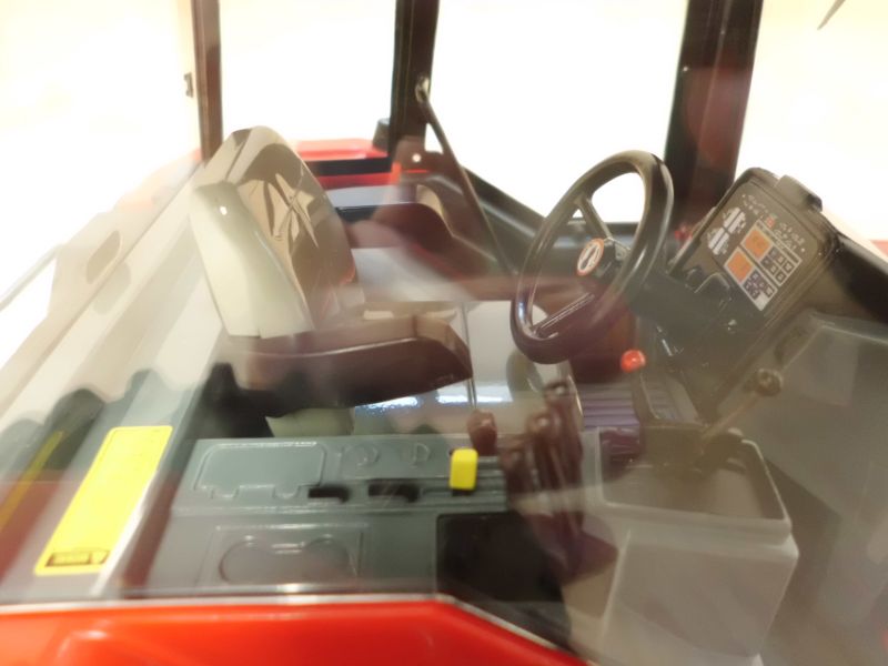 In der Kabine fällt die farblich gut getroffenen Seitenkonsole, mitsamt dem großen gelben Warnaufkleber ins Auge. Links unten am Armaturenbrett findet sich wie beim Original ein angedeuteter Aufkleber mit Seriennummer, Baujahr usw. . Der Kabinenhimmel ist nachgebildet. Dies geschah durch farbliche Ausgestaltung, Aufkleber (Luftausströmer hinten, oben) aber auch filigrane Bauteile (die vier Luftdüsen vorne, oben über lenkrad und Armaturentafel). Die typischen Digitalskalen auf dem Armaturenbrett sind durch Aufkleber dargestellt. -