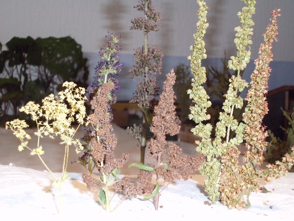 hab heut mal ein bischen rumprobiert was mann so im garten findet und zu bäumen verarbeiten kann ,hier das ergebnisbild 1,2und 3 sindblüten vom schmetterlingsflieder 4und 5 fruchtstände vom grossen ampfer bild 6 blüte vom frauenmantel und 7 blüte einer spierehe