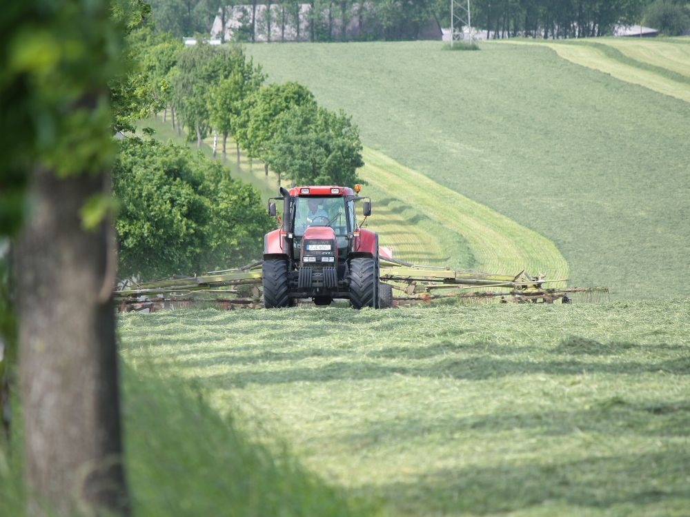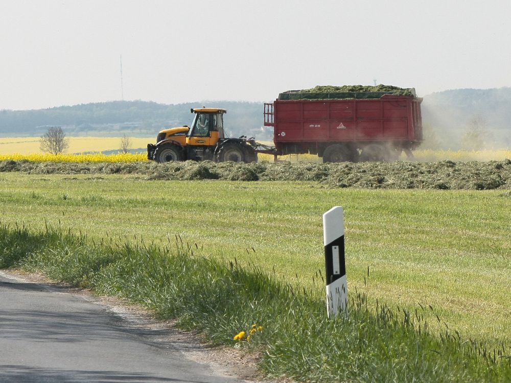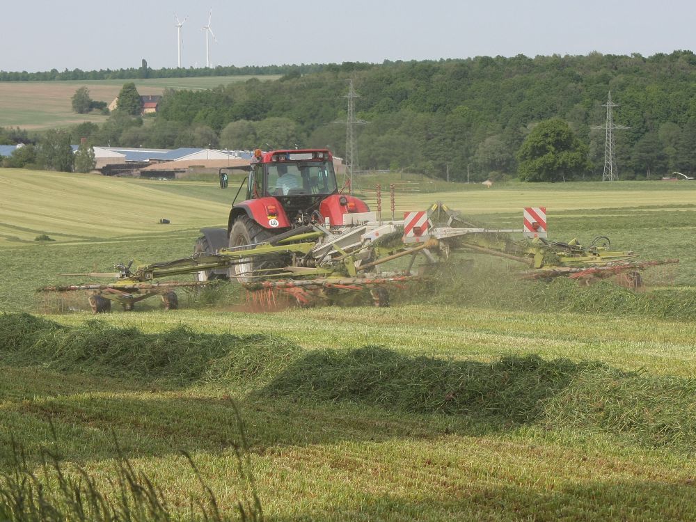 Heute bin ich endlich mal rechtzeitig zum Häckseln am richtigen Ort gewesen. Auf dem Weg zur Arbeit hab ich schon von Weitem einen Schwader gesehen. Auf dem Heimweg konnte ich dann von einer Stelle die ganze Sache schön überblicken. Die Luft flimmert allerdings schon ganz schön.