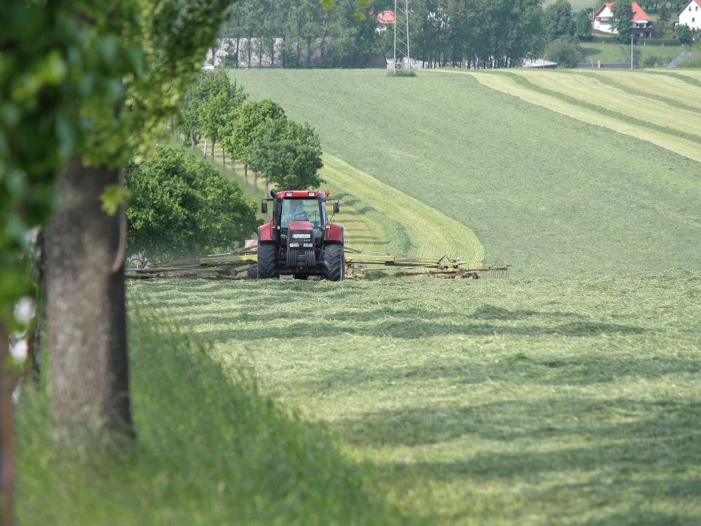 Heute bin ich endlich mal rechtzeitig zum Häckseln am richtigen Ort gewesen. Auf dem Weg zur Arbeit hab ich schon von Weitem einen Schwader gesehen. Auf dem Heimweg konnte ich dann von einer Stelle die ganze Sache schön überblicken. Die Luft flimmert allerdings schon ganz schön.
