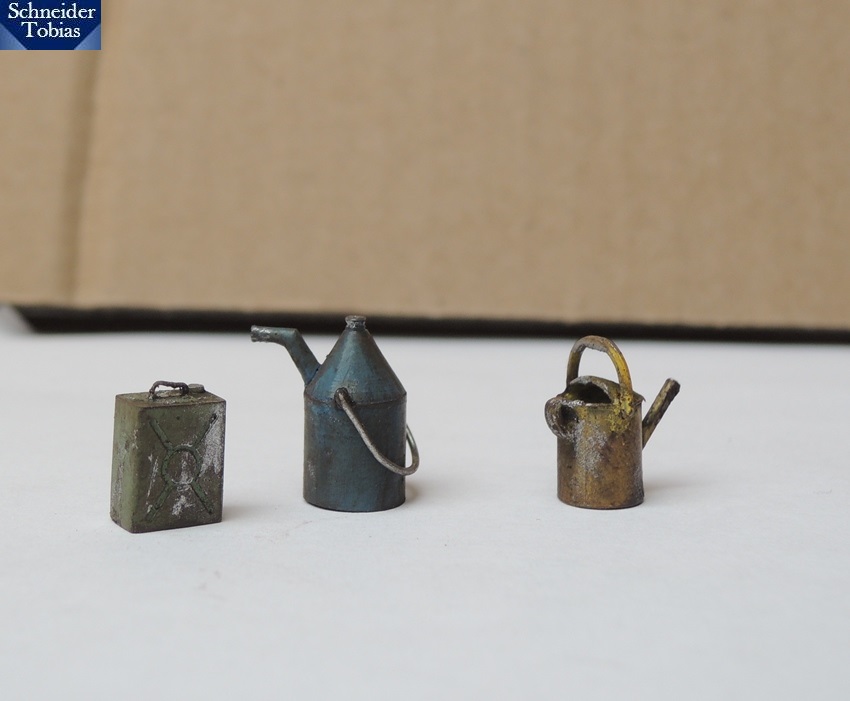Diese drei Behältnisse stammen aus einem Bausatz. Bei den Kannen habe ich einige Dinge geändert - z. B. die Öffnungen aufgebohrt.