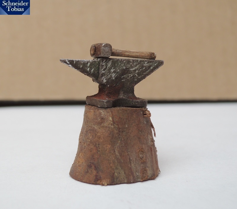 Für einen großen Amboss (ebenfalls Bausatz) gab es einen passenden Sockel aus einem Baumstamm sowie einen schweren Hammer der Marke Eigenbau mit Holzstiel.
