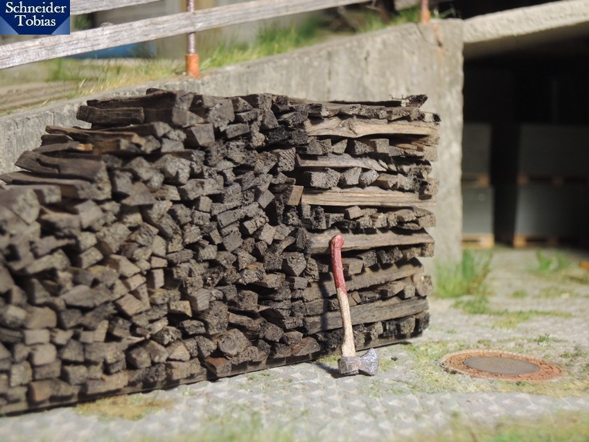 Daneben entstand ein alter, halb abgeräumter Holzstoß aus Meterscheiten. Bei Gelegenheit bekommt er noch ein paar Moosstellen und eine passendere Abdeckung.