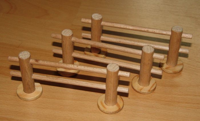 Dazu gab's noch eine Ladung Zäune. Die bestehen aus Buchen-Rundleisten, die in runde Sperrholzfüße geklebt sind.