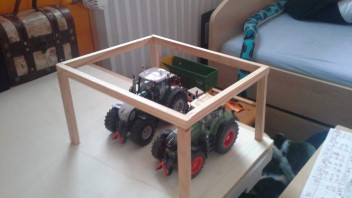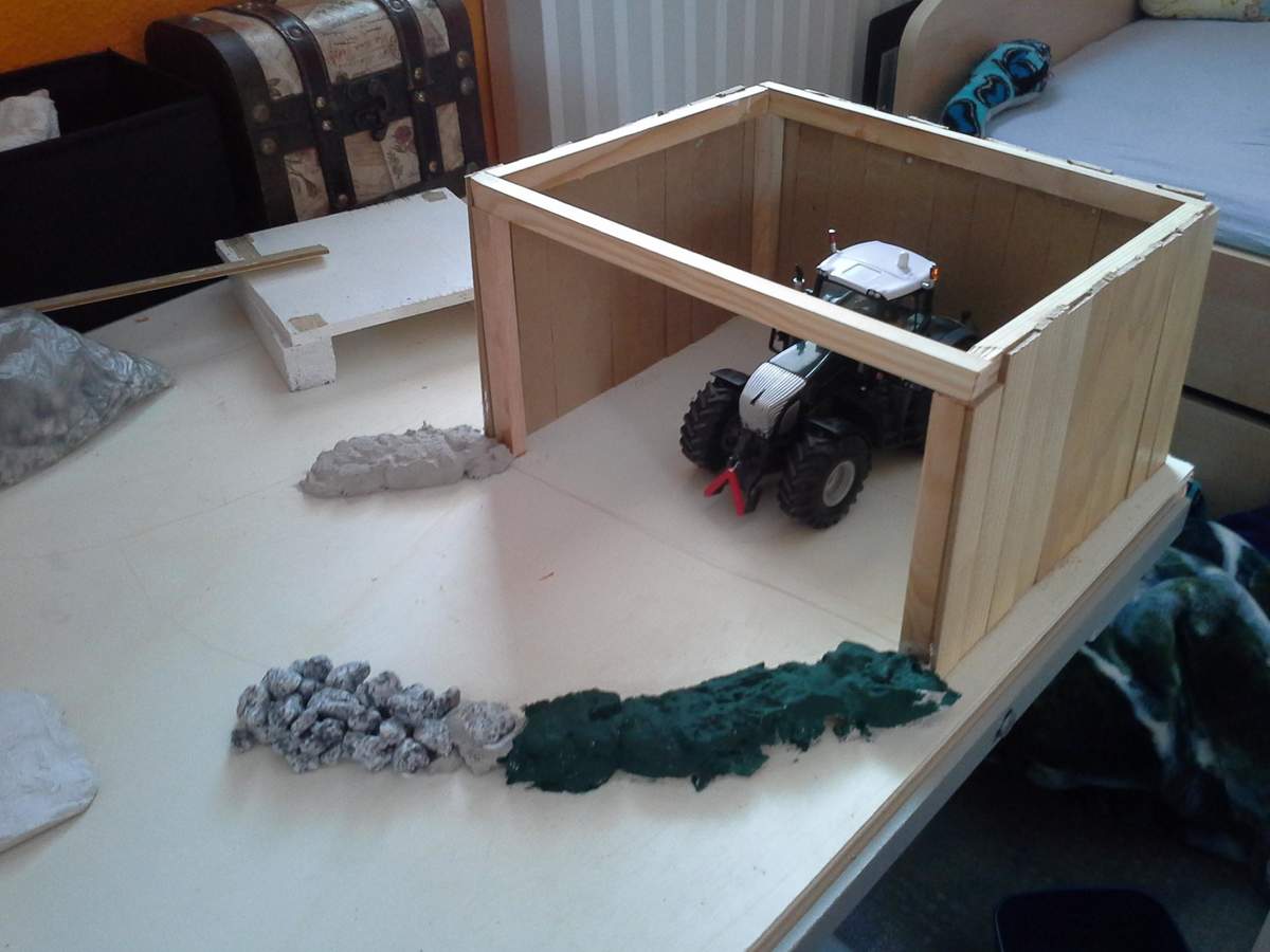 Denn in 1:32 passt das vorne und hinten nicht.Beim Unterstand würde ich dünnere Balken und Bretter benutzen, dann wirkt das nicht so klobig.