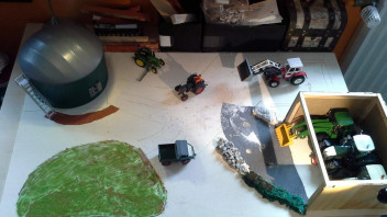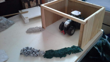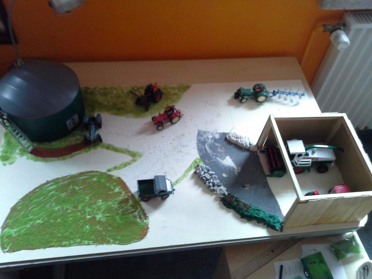 habe jetzt einen Plan für das Diorama. Oben Links kommt ein Maisfeld hin worauf ein Big X häckselt. Unten links eine kleine Kuweide. Oben Rechts ein Fahrsilo. -
