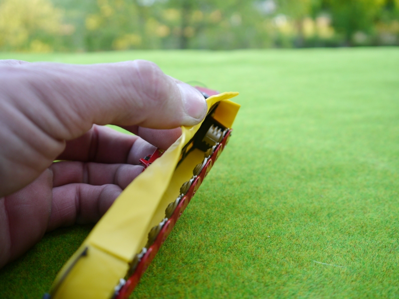 Und unter das flexible Schutztuch auf den Mähbalken und die Mähscheiben.