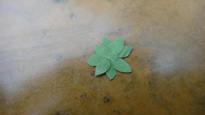 Als erstes zeichnet ihr euch ein Blatt auf und lasst unter der Zeichnung zur nächsten Blattreihe ca. 2 cm Platz, um es beim Ausschneiden festhalten zu können. Schneidet gleich mehrere aus, denn pro Pflanze werden 8 Blätter benötigt. Dann klebt ich die ersten zwei Blätter zusammen. Den Rand zum Festhalten könnt ihr nun auch entfernen. Das Ganze wiederholen. Nun klebt ihr beide Blattpaare versetzt aufeinander.Anschließend den passenden Grünton anmischen und auf eine Seite gut dick auftragen. Jetzt lasst ihr es ersteinmal gut durchtrocknen und streicht dann die andere Seite ein. Danach nur noch die einzelnen Blätter hochklappen.