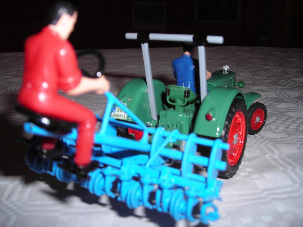 Ich habe dem MAN die Spur verbreitert und eine Pflegebereifung verpasst, eine kleine funktionierende Hydraulik angebaut und dazu noch eine selbst gebaute Rübenhackmaschine angehängt.