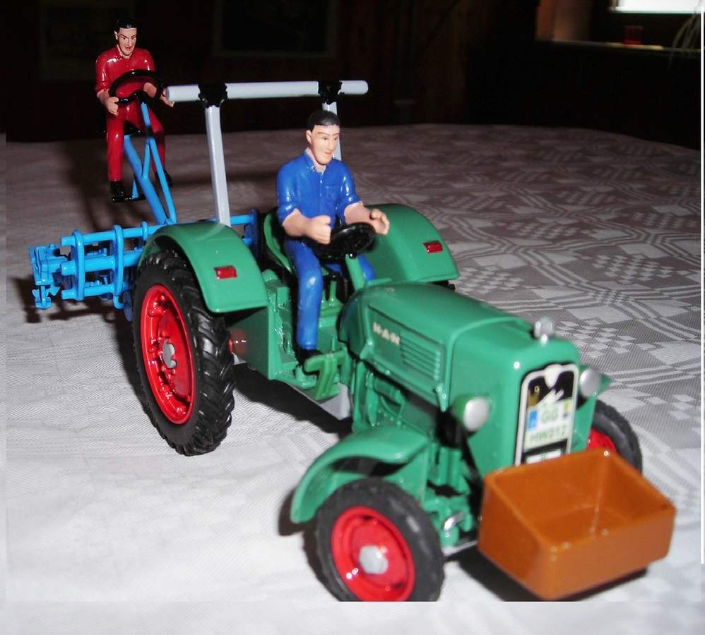 Ich habe dem MAN die Spur verbreitert und eine Pflegebereifung verpasst, eine kleine funktionierende Hydraulik angebaut und dazu noch eine selbst gebaute Rübenhackmaschine angehängt.